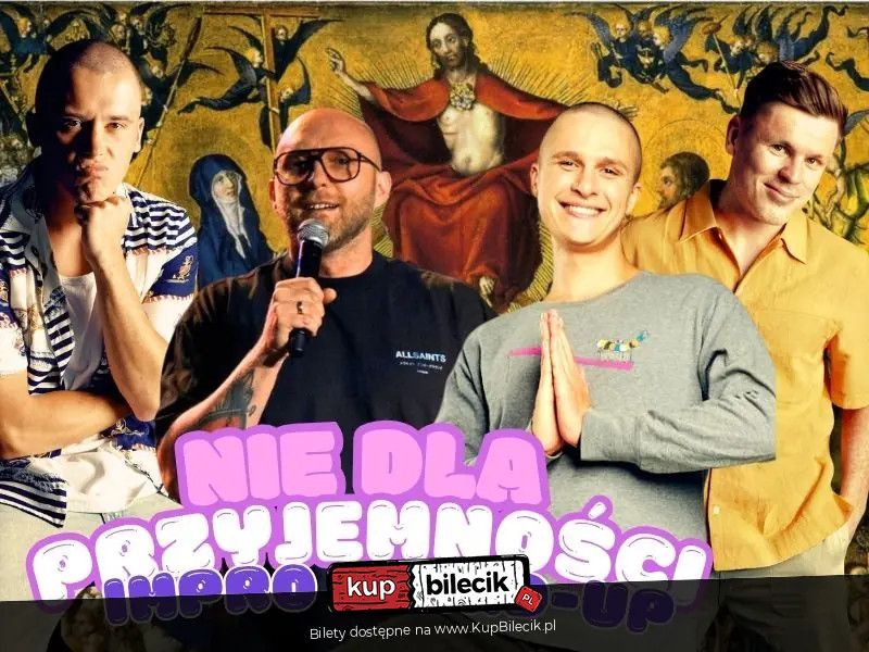 bilety: Po SPEKTAKULARNYM sukcesie pierwszego odcinka, wracamy z kolejną odsłoną serii. "Nie dla przyjemności" to dwie godziny luźnej gadki, opartej o bieżące wydarzenia, zaskakujące informacje i zbędne fakty, które zaśmiecą Wam głowy na co najmniej tak długo, jak długo trwa trzeci trymestr ciąży samicy walenia. Co ciekawe trwa tyle samo co pierwszy i nie różni się długością od ludzkiego. Na ekranie (telewizora) zobaczycie materiały poglądowe, które w MISTRZOWSKI sposób skomentują WSPANIALI komicy - Kuba Dąbrowski, Bartek Strusiński, Kuba Wu i Filip Puzyr. Bilety do nabycia na: KupBilecik.plStand-up: Nie dla przyjemności artyści: Kuba Dąbrowski, Bartek Strusiński, Kuba Wu, Filip PuzyrOstatnimi czasy polski stand-up płynie na fali nowych formatów komediowych taki jak "Masz minutę", "Roast me", czy "Litości". Surferskie życie nie jest nam obce, więc płyniemy i my. "Nie dla przyjemności" to dwie godziny luźnej gadki, opartej o bieżące wydarzenia, zaskakujące informacje i zbędne fakty, które zaśmiecą Wam głowy na co najmniej tak długo, jak długo trwa trzeci trymestr ciąży samicy walenia. Co ciekawe trwa tyle samo co pierwszy i nie różni się długością od ludzkiego. Bilety do nabycia na: KupBilecik.pl |